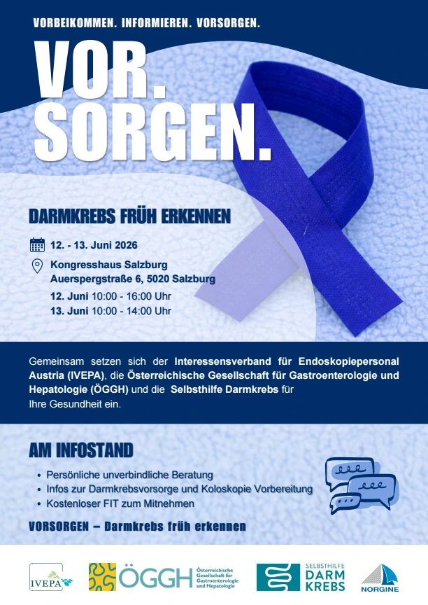 Im Rahmen der gemeinsamen Jahrestagung der Österreichischen Gesellschaft für Gastroenterologie und Hepatologie (ÖGGH) und des Interessensverbands Endoskopiepersonal Austria (IVEPA) wird daher ein öffentlicher Infostand zur Darmkrebsvorsorge organisiert.